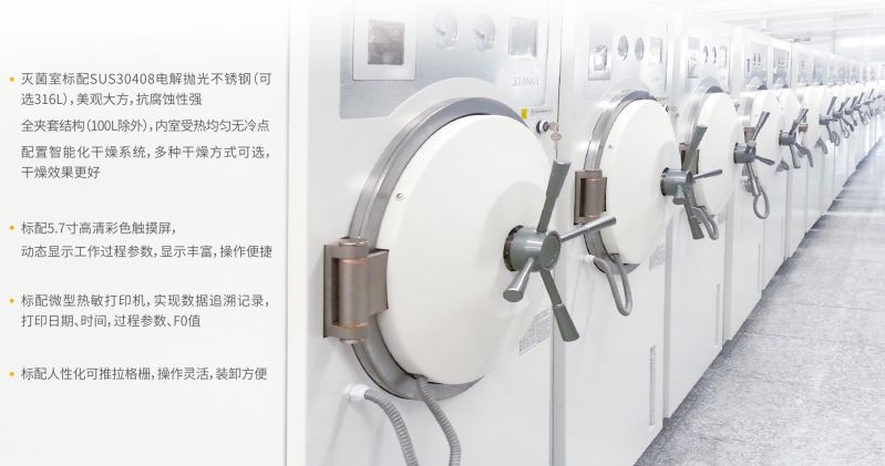 温度、压力、时间、运行状态、故障报警液晶显示智能化干燥系统,器械干燥后残余湿度不超过0.2%,敷料干燥后残余湿度不超过1%内置蒸汽发生器,微电脑控温技术,省时节能超温自动保护装置,门压力温度双向安全联锁装置,超压自动泄压的安全阀,短路保护、过压保护。